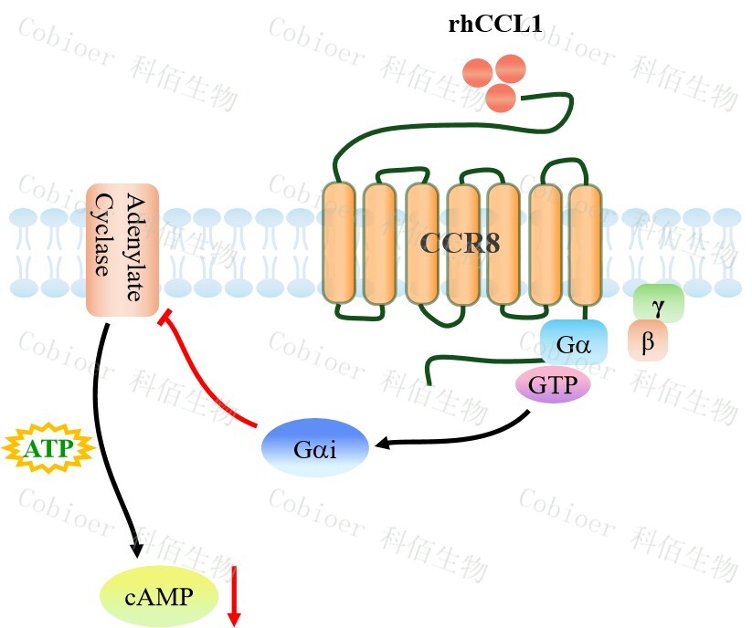 cAMP 在 G 蛋白偶聯(lián)受體(GPCR)信號轉導中是一種關(guān)鍵的第二信使。當配體結合到 GPCR,構象發(fā)生變化,激活受體接著(zhù)激活 G 蛋白,Gi 的激活導致腺苷酸環(huán)化酶調控 cAMP 的下調。CCR8 藥靶模型很好的模擬了體內 CCR8 的信號轉導過(guò)程,原理見(jiàn)下圖所示。