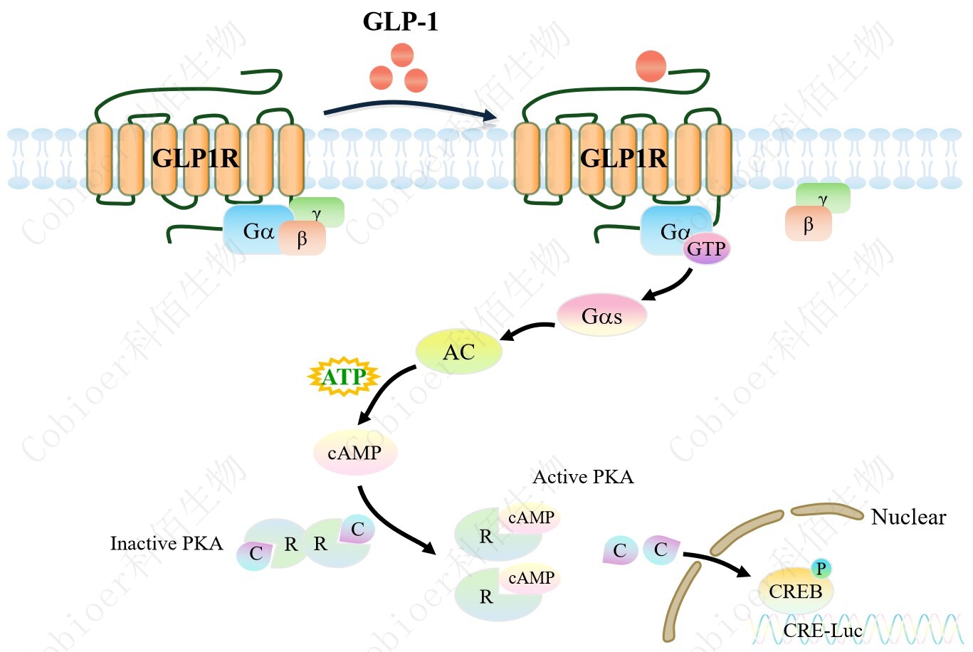 GLP1R CRE-Luc HEK293 報告基因藥靶模型很好的模擬了體內 GLP1R 的信號轉導過(guò)程,原理見(jiàn)下圖所示。