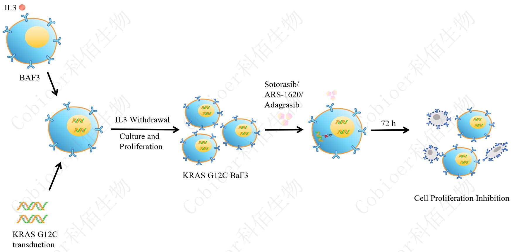 BaF3(小鼠原 B 細胞)的生長(cháng)和增殖需要 IL-3 的維持。通過(guò)引入各種表達激酶的基因, 能作為 BaF3 的驅動(dòng)基因,讓 BaF3 不再依賴(lài) IL-3 而增殖,進(jìn)而激酶基因成為 BaF3 增殖依賴(lài)的驅動(dòng)基因,用于評估小分子藥物對激酶的靶向抑制作用,原理及流程見(jiàn)下圖所示。