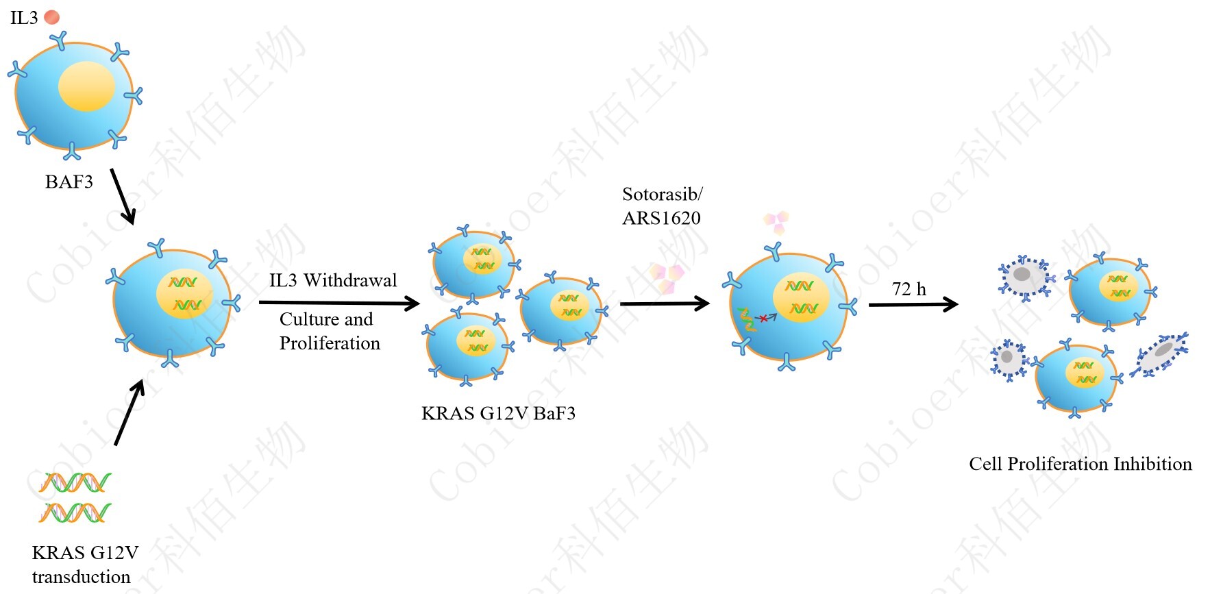 BaF3(小鼠原 B 細胞)的生長(cháng)和增殖需要 IL-3 的維持。通過(guò)引入各種表達激酶的基因, 能作為 BaF3 的驅動(dòng)基因,讓 BaF3 不再依賴(lài) IL-3 而增殖,進(jìn)而激酶基因成為 BaF3 增殖依賴(lài)的驅動(dòng)基因,用于評估小分子藥物對激酶的靶向抑制作用,原理及流程見(jiàn)下圖所示。