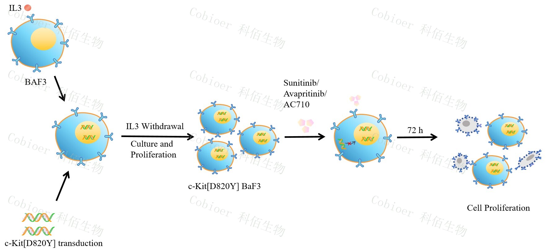 | c-Kit[D820Y] BaF3 藥靶細胞,通過(guò)轉導突變狀態(tài)的 c-Kit[D820Y] 基因 到 BaF3 細胞系中,穩定表達人突變形態(tài)下的 c-Kit[D820Y] 基因。 BaF3(小鼠原 B 細胞)的生長(cháng)和增殖需要 IL-3 的維持。通過(guò)引入各種表達激酶的基因, 能作為 BaF3 的驅動(dòng)基因,讓 BaF3 不再依賴(lài) IL-3 而增殖,進(jìn)而激酶基因成為 BaF3 增殖依賴(lài)的驅動(dòng)基因,用于評估小分子藥物對激酶的靶向抑制作用,原理及流程見(jiàn)下圖所示。 ![]() Figure 1. c-Kit [D820Y] BaF3 細胞的構建原理圖 |