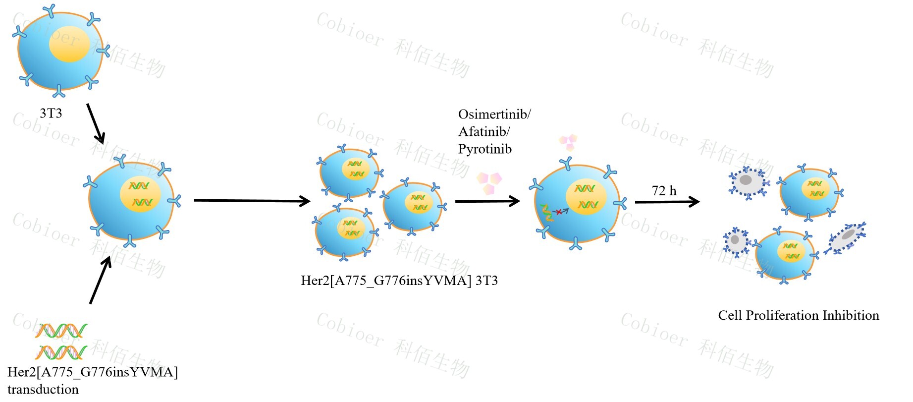 HER2[A775_G776insYVMA] 3T3 藥靶細胞,通過(guò)轉導突變狀態(tài)的 HER2[A775_G776insYVMA] 基因到 3T3 細胞系中 , 穩定表達人突變形態(tài)下的 HER2[A775_G776insYVMA]基因,原理及流程見(jiàn)下圖所示。