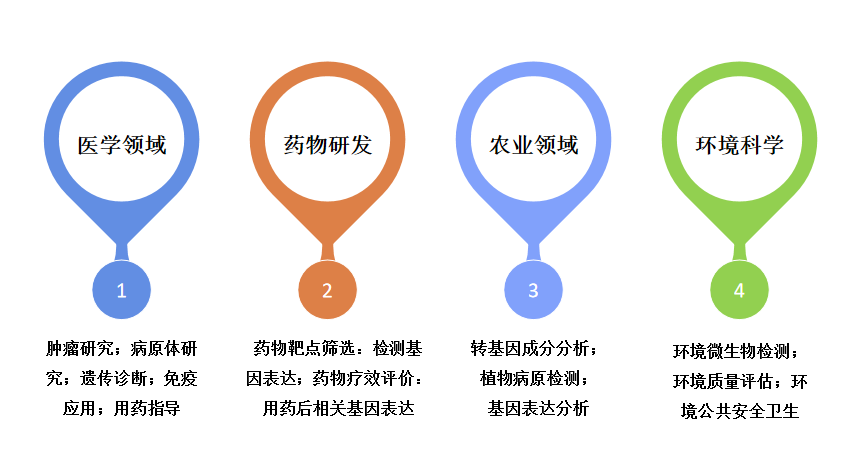 實(shí)時(shí)熒光定量PCR具有靈敏度高、特異性強、快速高效的特點(diǎn),廣泛應用于生物醫藥、臨床診斷、農業(yè)、環(huán)境科學(xué)等多個(gè)領(lǐng)域,常用于檢測基因表達、基因變異、轉基因等。