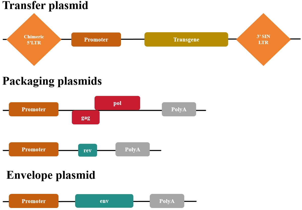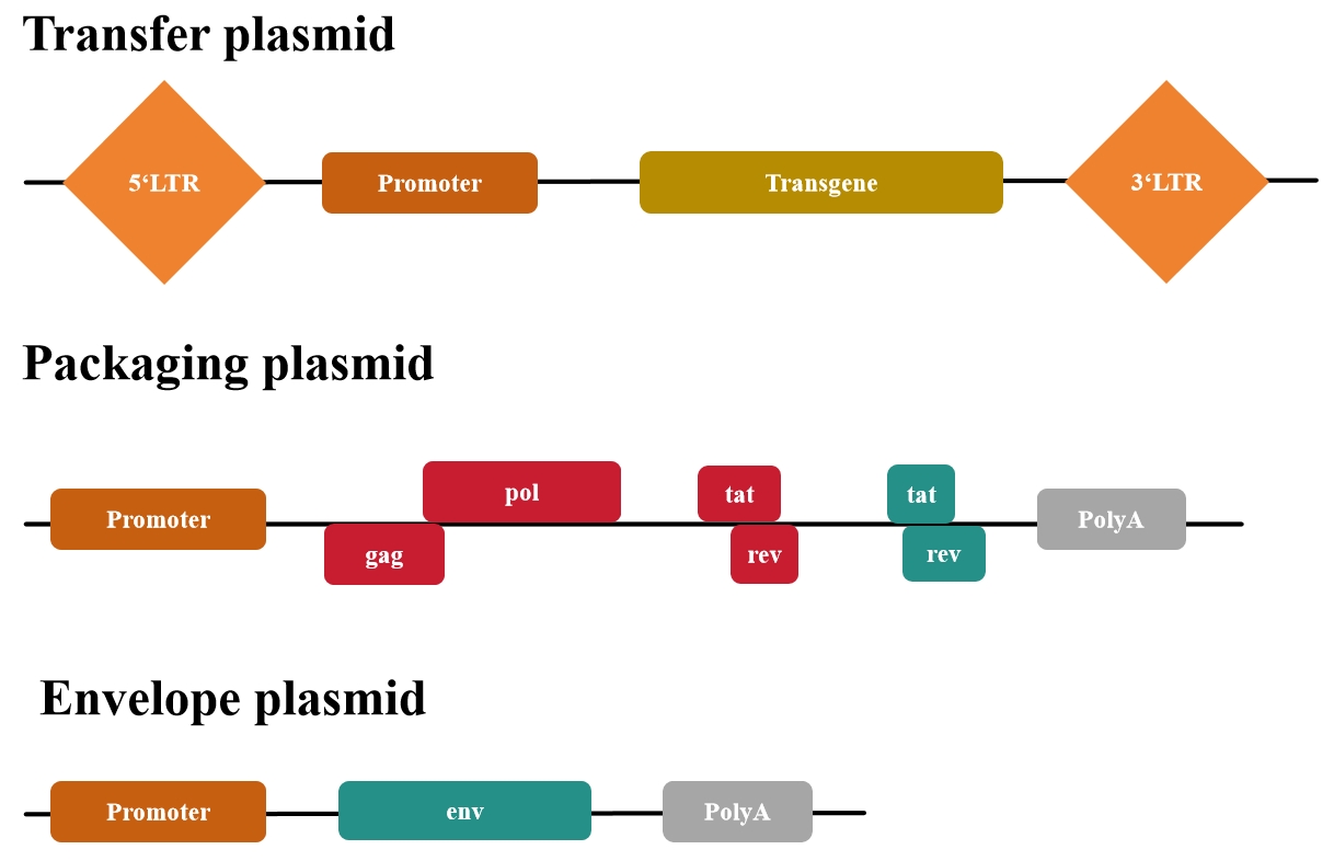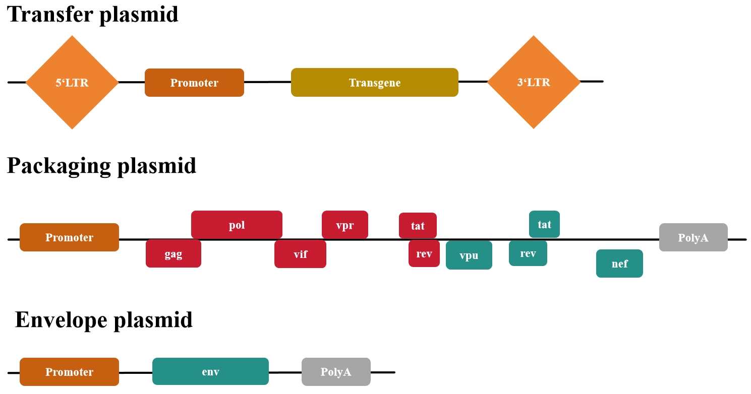第三代系統在幾個(gè)關(guān)鍵方面進(jìn)一步提高了第二代系統的安全性。首先,包裝系統被拆分成兩個(gè)質(zhì)粒。雖然更安全,但該系統使用起來(lái)可能更麻煩,并且由于額外的質(zhì)粒導致病毒滴度較低。其次,第三代系統不需要tat。相反,轉移質(zhì)粒包含一個(gè)與異源啟動(dòng)子(通常是CMV或RSV)融合的嵌合5'LTR,從而無(wú)需Tat的反式激活。