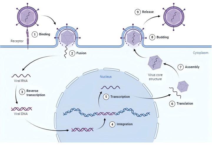 慢病毒(LV)是一種有包膜的病毒,最常見(jiàn)的是VSV-G,它通過(guò)與特定的細胞表面蛋白(比如LDLR)結合,隨后進(jìn)行膜融合進(jìn)入細胞,將含有其遺傳信息的病毒RNA注入細胞質(zhì)。這種單鏈病毒RNA通過(guò)逆轉錄轉化為DNA。病毒DNA進(jìn)入細胞核,并通過(guò)病毒整合酶整合到宿主細胞基因組中。