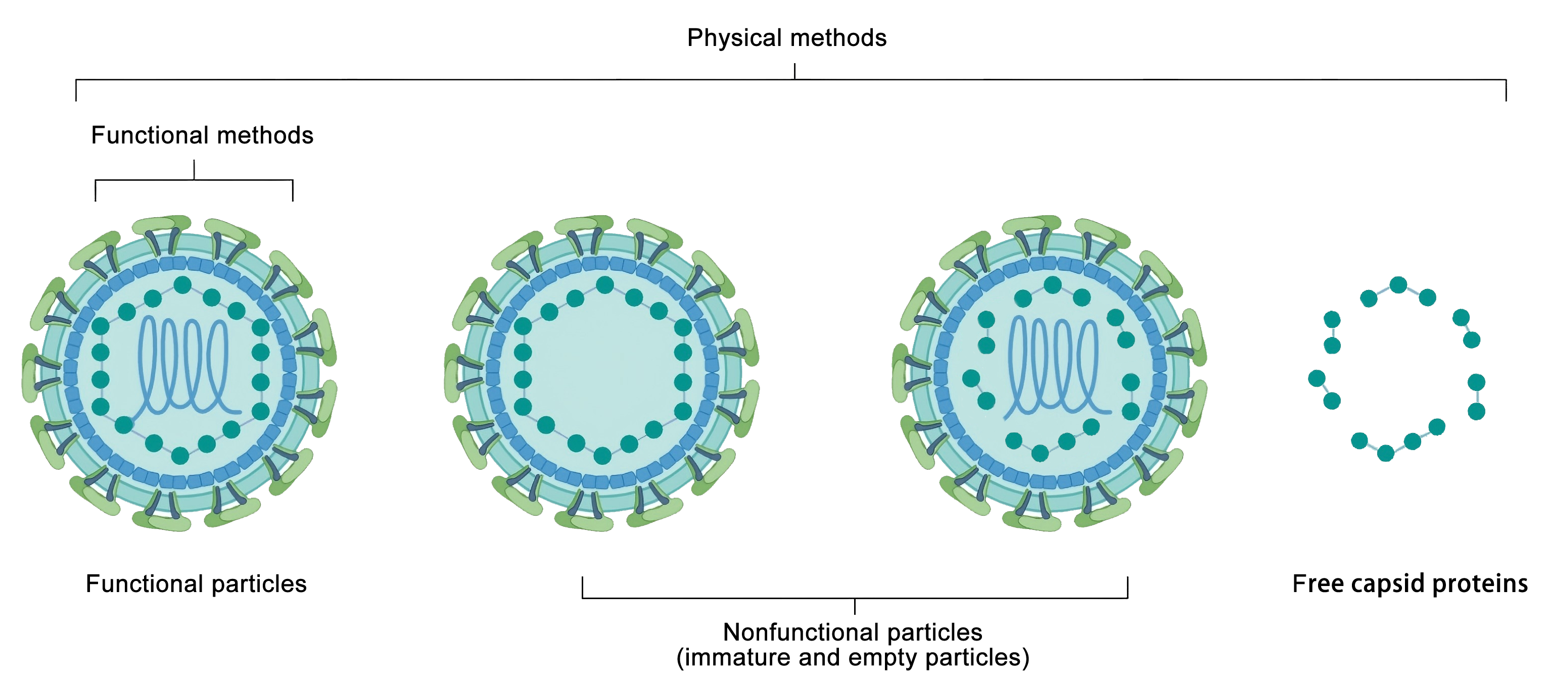 圖7 慢病毒包裝上清液中存在的產(chǎn)物。物理方法可以測量上清液中釋放的功能性和非功能性顆粒,以及游離衣殼蛋白(例如 p24)。功能性滴定方法專(zhuān)門(mén)測量功能性病毒顆粒。