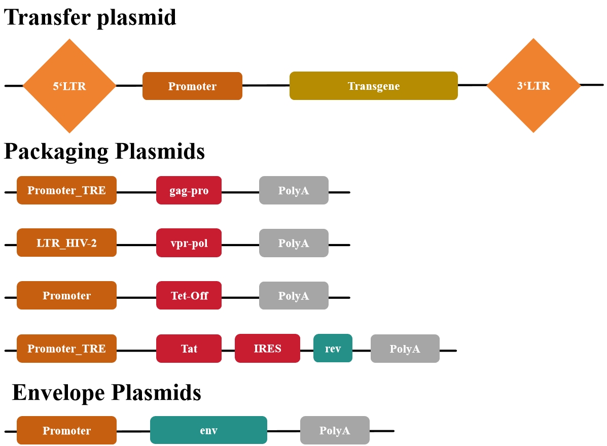 第二代慢病毒質(zhì)粒通過(guò)去除輔助基因,大大提高了慢病毒載體生產(chǎn)的安全性。第二代質(zhì)粒包含tat,因為轉移質(zhì)粒的5' LTR被用作啟動(dòng)子,而這需要Tat才能激活。
