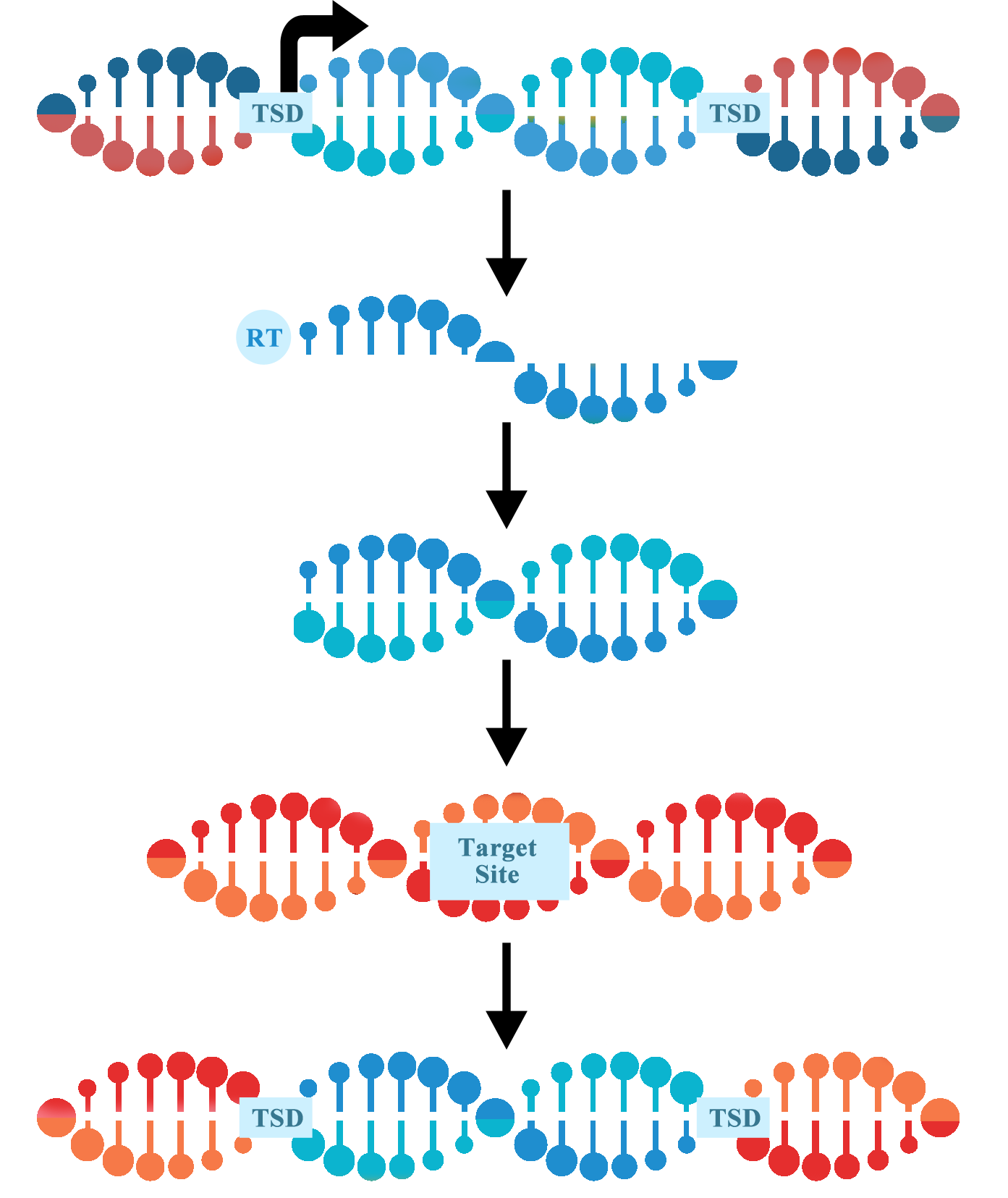 圖 1:逆轉錄轉座子轉座概述。逆轉錄轉座子通過(guò)“復制粘貼Ctrl C+V”機制進(jìn)行移動(dòng)。
