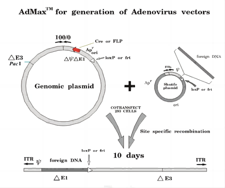 AdMax包裝系統是通過(guò)Cre/loxP 獲得重組病毒,這個(gè)過(guò)程發(fā)生在HEK293細胞中,從而避免在細菌中重組。將克隆了外源基因的腺病毒穿梭質(zhì)粒與攜帶了腺病毒大部分基因組的包裝質(zhì)粒共轉染HEK293細胞,利用Cre/loxP系統的作用實(shí)現重組,產(chǎn)生重組腺病毒。這個(gè)系統有多種優(yōu)勢,包括操作簡(jiǎn)便、重組效率高、獲得的病毒產(chǎn)率高、目的基因的表達水平高(因為mCMV啟動(dòng)子比hCMV啟動(dòng)子強若干倍)等。