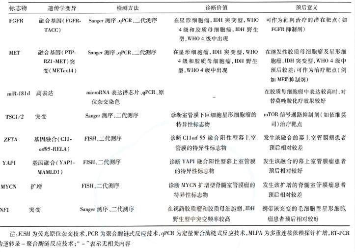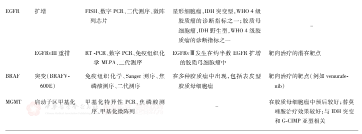 腦膠質(zhì)瘤確診需通過(guò)腫瘤切除術(shù)或活組織檢查術(shù)獲取標本,進(jìn)行組織病理學(xué)和分子病理學(xué)整合診斷,以確定病理分級和分子亞型。分子標志物對腦膠質(zhì)瘤的個(gè)體化治療及臨床預后判斷具有重要意義。