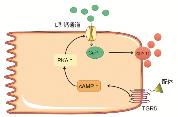 TGR5在維持葡萄糖穩態(tài)和胰島素敏感性方面上的效果已得到廣泛證明。例如,使用TGR5激動(dòng)劑6α-乙基-23(S)-甲基-膽酸(6α-ethyl-23(S)-methyl-cholic acid,INT-777)可以提高肥胖小鼠的胰島素敏感性,7-硫酸膽酸以TGR5依賴(lài)性方式增加胰島素抵抗小鼠的葡萄糖耐量等。機體各組織的TGR5可通過(guò)不同的分子機制參與血糖代謝的調節。TGR5對于血糖代謝的作用,主要與腸促胰島素釋放相關(guān),通過(guò)刺激腸內分泌L細胞分泌GLP-1來(lái)實(shí)現。既往研究發(fā)現,GLP-1可促進(jìn)胰島素分泌,促進(jìn)胰島β細胞存活和增殖,抑制細胞凋亡,并且可有效刺激2型糖尿病患者的胰島素分泌并降低血糖。早期觀(guān)點(diǎn)認為T(mén)GR5被激活后刺激腸內分泌L細胞內cAMP水平增加,線(xiàn)粒體氧化磷酸化增加,ATP/ADP比例增加,導致ATP依賴(lài)性鉀離子通道(KATP)關(guān)閉,開(kāi)放鈣離子通道,促進(jìn)鈣離子內流,釋放GLP-1。但后續大量研究驗證了GLP-1的分泌確實(shí)與cAMP升高,胞內鈣離子升高有關(guān),但與ATP依賴(lài)性鉀離子通道無(wú)關(guān)。Brighton等的實(shí)驗進(jìn)一步驗證了GLP-1分泌與L細胞內的cAMP和Ca2+濃度變化有關(guān),并且說(shuō)明了該作用主要由位于基底外側L細胞膜上的TGR5介導。近年來(lái),Goldspink等發(fā)現腸L細胞上的TGR5被激活后,通過(guò)cAMP/PKA途徑,開(kāi)放了L型Ca2+通道,促進(jìn)Ca2+內流,引發(fā)GLP-1分泌。