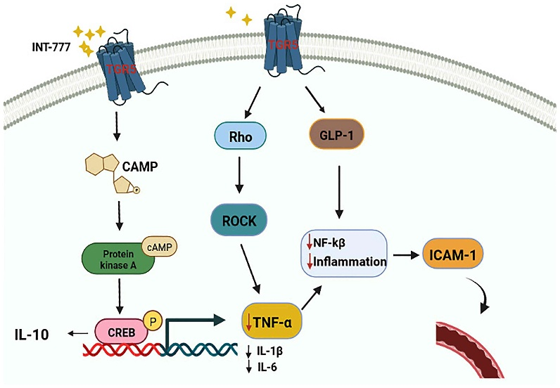 有報道稱(chēng),在慢性炎癥反應中,TNF-α可激活多種半胱天冬酶,導致炎癥細胞凋亡。TGR5已被發(fā)現通過(guò)調節Rho/Rho相關(guān)蛋白激酶(ROCK)信號通路來(lái)調節TNF-α。作為T(mén)GR5的激動(dòng)劑,INT-777可以阻斷TNF-α誘導的RMEC增殖和遷移,抑制TNF-α促進(jìn)血管通透性的作用。此外,已有證據表明,TGR5激動(dòng)劑可以通過(guò)激活TGR5- camp蛋白激酶A (PKA)信號通路,上調IL-10的表達,發(fā)揮抗炎和免疫抑制作用,降低促炎細胞因子IL-1β、IL-6和TNF-α的表達。有研究表明,GLP-1可通過(guò)抑制NF-κB延緩ECs的損傷,進(jìn)而抑制IL-1β、IL-6、TNF-α等炎癥因子的分泌。而各種研究證實(shí)GLP-1是TGR5的靶點(diǎn)之一;其分泌依賴(lài)于TGR5。因此,推測激活TGR5可能是刺激GLP-1分泌、延緩RMEC損傷的有效途徑。