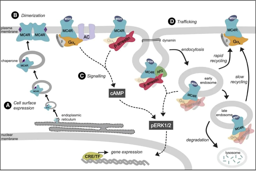 MC4R (黑皮質(zhì)素4受體) 是黑皮質(zhì)素受體家族成員之一,其家族屬于視紫紅質(zhì)樣A類(lèi)GPCR,成員還包括:MC1R、MC2R、MC3R和MC5R。黑皮質(zhì)素受體 (MC1R-MC5R) 位于多種細胞類(lèi)型上,并遍布大多數身體系統。MC4R是中樞黑皮質(zhì)素系統的重要組成部分,主要在下丘腦室旁核(PVH)中表達,是一種A類(lèi)GPCR。在高能量平衡狀態(tài)下,阿片黑皮質(zhì)素原 (POMC) 神經(jīng)元釋放多肽MC4R激動(dòng)劑-α-黑素細胞刺激激素(α-MSH)。α- MSH與MC4R結合會(huì )激活MC4R信號傳導,抑制食欲和食物攝入。在低能量平衡狀態(tài)下,下丘腦室旁核中釋放AgRP (agouti-related peptide)。AgRP作為MC4R與α- MSH結合的競爭性拮抗劑,也是MC4R反向激動(dòng)劑,抑制MC4R信號傳導。