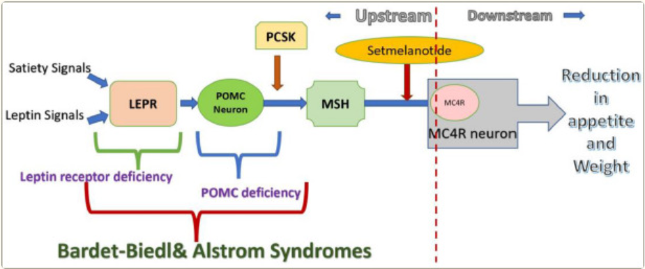 當外周給藥時(shí),Setmelanotide可以穿透血腦屏障,作用于下丘腦的室旁核和下丘腦外側區,這兩個(gè)與食欲調節相關(guān)的區域。通過(guò)與 MC4R 結合,它填補了下丘腦瘦素 - 黑皮質(zhì)素通路中缺失的一環(huán),從而抑制食欲并改善胰島素抵抗。它還能通過(guò)將底物氧化轉向脂肪,從而提高靜息能量消耗。