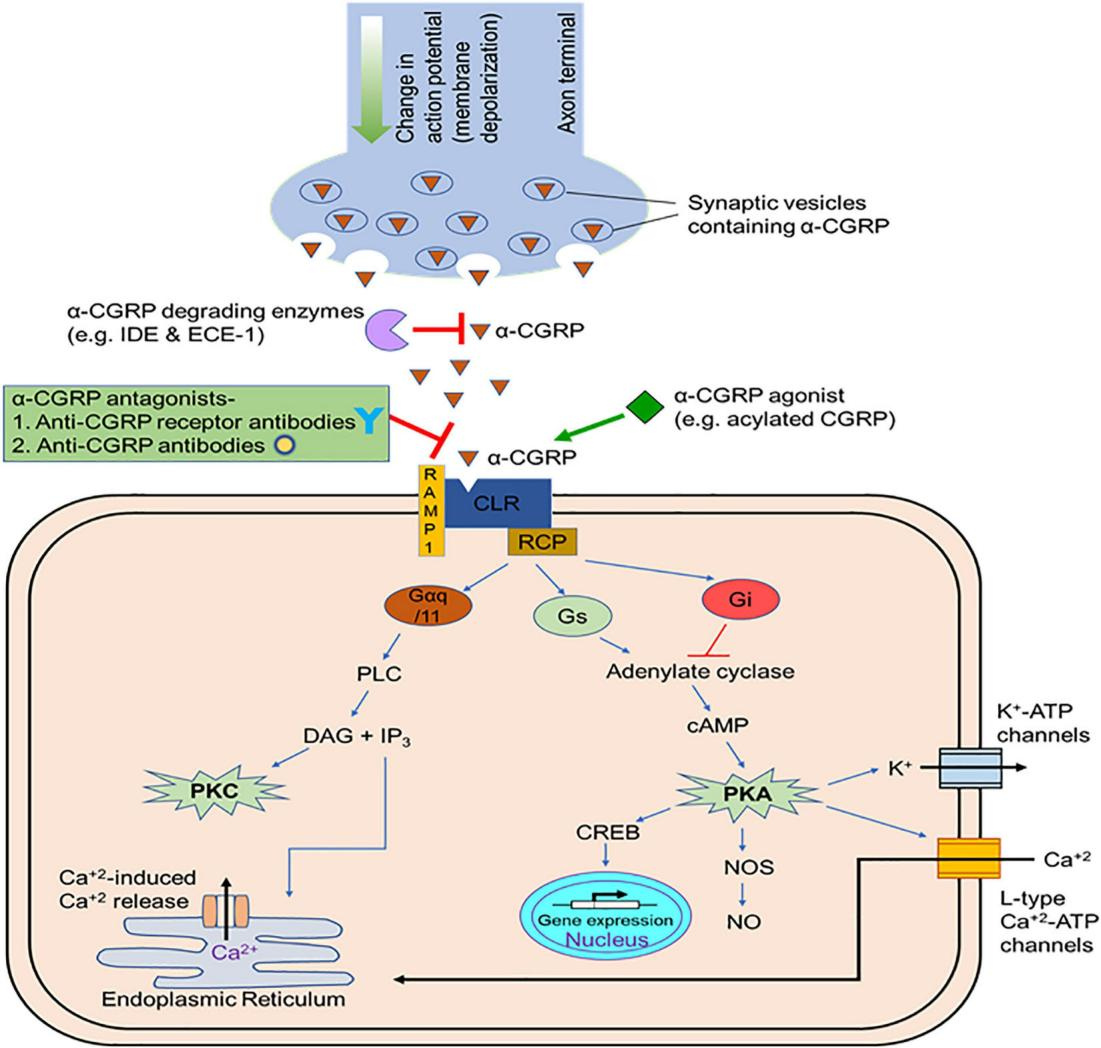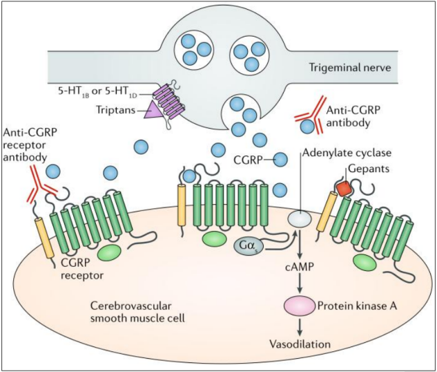降鈣素基因相關(guān)肽(calcitonin gene-related peptid,CGRP)是一個(gè)含有37個(gè)氨基酸殘基的感覺(jué)神經(jīng)源性多肽,分為α-CGRP和β-CGRP兩個(gè)亞型,廣泛分布于中樞神經(jīng)系統(主要是三叉神經(jīng)血管系統、丘腦和小腦)。CGRP是一種強效的血管擴張劑,它主要由感覺(jué)神經(jīng)(如三叉神經(jīng))釋放。CGRP釋放后與腦血管平滑肌細胞表面的CGRP受體結合,引起腦血管擴張。CGRP受體的結構主要包括:降鈣素受體樣受體(CALCRL)、活性修飾蛋白受體(RAMP)及結構蛋白受體(RCP)。CGRP受體復合物是一種G蛋白偶聯(lián)受體,通過(guò)激活蛋白激酶A系統,參與疼痛信息的病理調控過(guò)程。