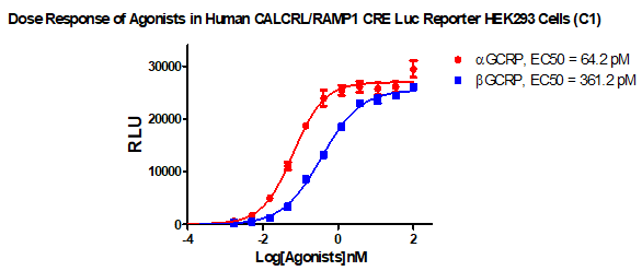 針對CGRP靶點(diǎn)藥物開(kāi)發(fā)研究的需求,科佰生物開(kāi)發(fā)了CALCRL/RAMP1/CRE-Luc/HEK293藥篩細胞模型,歡迎來(lái)電咨詢(xún)。部分數據展示如下: