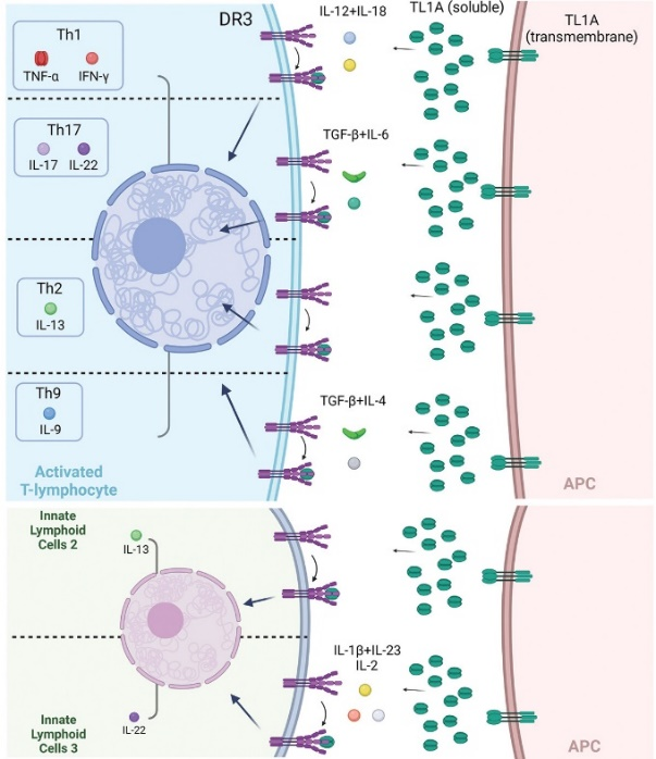 TL1A/DR3信號的下游作用包括產(chǎn)生幾種關(guān)鍵的因子,如IFN-γ、TNF-α、IL-6和IL-17,以及IL-2、IL-4、IL-13,這些促炎因子表達上調,并可能產(chǎn)生致病作用。