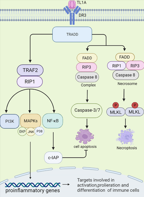 在靜息的T細胞中,DR3以可溶性形式表達,保護細胞免于凋亡?;罨腡細胞表達跨膜DR3。sTL1A結合DR3 (膜結合形式)激活下游信號級聯(lián),從而調節免疫反應和炎癥。sTL1A/DR3相互作用可觸發(fā)兩種不同的信號通路,分別引起炎癥和細胞凋亡。首先,DR3的死亡結構域與細胞質(zhì)中的適配蛋白TNFR相關(guān)死亡結構域蛋白(TRADD)結合,然后招募TNFR相關(guān)因子2 (TRAF2)和受體相互作用蛋白1 (RIP1)。這些復合物激活MAPKs (ERK、p38和JNK)、NF-κB和效應激酶PI3K信號傳導。最后,激活的信號傳導調節促炎基因的表達,參與免疫相關(guān)疾病的發(fā)生。TRADD結合FAS相關(guān)死亡結構域(FADD)和RIP3,激活半胱氨酸天冬氨酸特異性蛋白酶-8 (caspase-8)形成復合物,進(jìn)一步激活下游caspase通路(如caspase-3和-7),誘導凋亡細胞死亡。當caspase-8活性被阻斷時(shí),FADD、RIP3、RIP1與下游效應分子混合譜系激酶結構域樣蛋白(mixed lineage kinase domain-like protein, MLKL)在磷酸化后形成胞質(zhì)“壞死體”復合體。然后,MLKL寡聚到細胞膜上,導致壞死性細胞死亡,這是一種伴有強烈炎癥的細胞死亡形式。在這個(gè)過(guò)程中,NF-κB被證明可以誘導細胞凋亡抑制蛋白(c-IAP)的激活,從而介導細胞凋亡的負反饋調節和抑制。事實(shí)上,更多的證據表明,sTL1A與DR3的連接優(yōu)先誘導淋巴細胞的促炎途徑而不是凋亡。