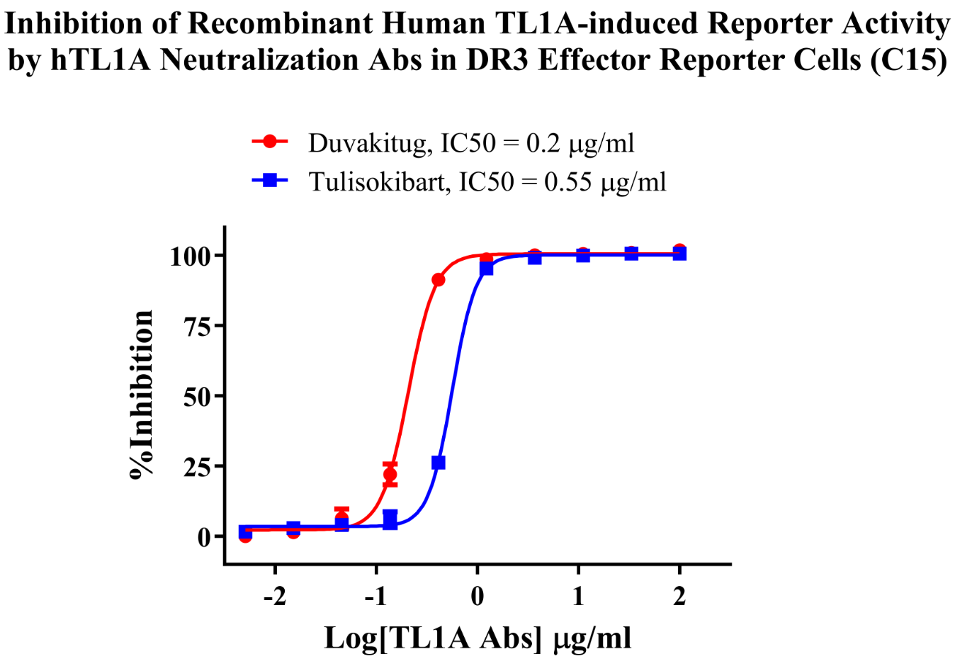 Figure 6. Blocking of TL1A induced DR3 Effector Reporter Cells (C15) Activity by TL1A Neutralizaiton Abs  with TL1A Target  Cell.