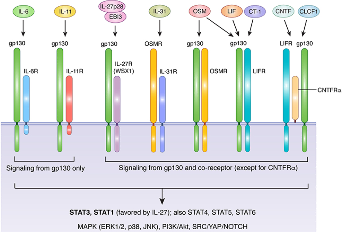 IL11是IL6細胞因子家族的一種多功能細胞因子,除IL6外,還包括白血病抑制因子(LIF)、抑癌素M (OSM)、纖毛神經(jīng)營(yíng)養因子(CNTF)、心肌營(yíng)養因子-1 (CT-1)、心肌細胞因子樣細胞因子(CLC)、神經(jīng)生成素(NPN/CT-2)、IL-27和IL-31。