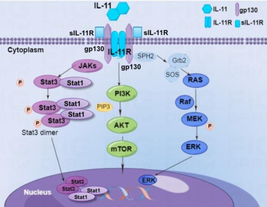 JAK/STAT信號通路是IL-11最廣為人知的下游信號通路。IL-11信號轉導涉及GP130,由STAT3的激活和相對低水平的STAT1介導。在IL-11與其受體結合后,JAK與適配蛋白形成復合物。STATs隨后被酪氨酸磷酸化,導致其二聚化并與受體復合物分離?;罨腏AK激酶可導致酪氨酸磷酸化和STAT家族轉錄因子的刺激。IL-11可誘導酪氨酸磷酸化STAT3和STAT1,但后者在較高濃度下以劑量依賴(lài)性的方式發(fā)生。STAT在特定酪氨酸殘基上被JAK磷酸化,并且STAT同二聚體和異二聚體通過(guò)SH2結構域對接。磷酸化的STATs二聚化,轉運到細胞核中,并觸發(fā)靶基因的轉錄調節。