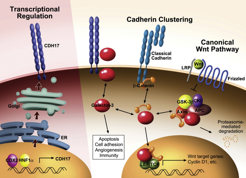 CDH17(Cadherin 17,LI-cadherin)序列由七個(gè)細胞外的鈣粘蛋白結構域和一個(gè)非常短的細胞質(zhì)結構域形成。與其他經(jīng)典的鈣粘蛋白不同,CDH17是一種鈣依賴(lài)性跨膜糖蛋白,可介導細胞在腸上皮中的細胞粘附。